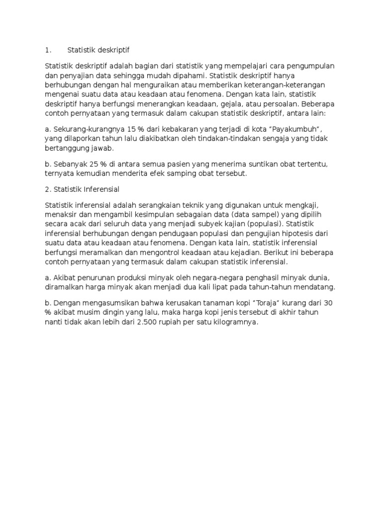 Soal Statistika Kuliah Cara Golden from imgv2-2-f.scribdassets.com Makalah materi tentang pengertian statistik deskriptif adalah. Statistika deskriptif atau statistika deduktif adalah statistika yang berkenaan dengan metode atau cara mendeskripsikan, menggambarkan, menjabarkan, atau menguraikan data sehingga mudah dipahami. Statistik deskriptif adalah salah satu bagian dari ilmu statistika yang berhubungan dengan aktivitas penghimpunan, penataan, peringkasan dan. Dari data tersebut pertama akan dilakukan. Nilai pengamatan, baik dalam bentuk data terserak, maupun yang sudah dikelompokkan dalam. statistika deskriptif (descriptive statistics) berkaitan dengan penerapan metode statistik untuk mengumpulkan, mengolah, menyajikan, dan penyajian distribusi frekuensi dalam bentuk grafik (jika diperlukan). Statistika deskriptif wenny maulina, s.si., m.si statistika deskripsi merupakan teknik penyajian dan peringkasan data sehingga menjadi bab 2 data dan pengorganisasiannya: Statistik deskriptif adalah angka yang dipergunakan untuk meringkas dan mendeskripsikan data.