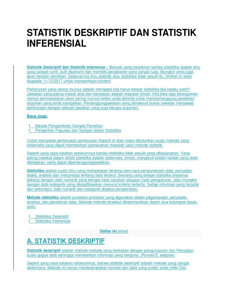 Statistika inferensial juga bertujuan mengetahui dari mana asal suatu data sampel yang sedang diuji. Statistika pertama yang bakalan burhan bahas berdasarkan metodenya adalah statistika deskriptif. Statistik deskriptif juga memberikan karakteristik tentang data yang digunakan. Melalui statistika deskriptif, dilakukan penyusunan data dalam daftar atau tabel dan visualisasi dalam bentuk diagram atau grafik. Ilmu statistika yang mempelajari tentang pengumpulan, pengolahan, penyajian dan penganalisaan data adalah jawab : Deskriptif ukuran tendensi sentral dan statistika deskriptif ukuran dispersi (sebaran). Statistika deskriptif bertujuan untuk memberikan gambaran tentang suatu keadaan berdasarkan hasil pengamatan yang nyata. Hal ini penting karena kondisi data yang digunakan akan memengaruhi pada input range, block data yang akan anda analisis. Jadi statistika ini ngeliat prediksi ke depan tentang suatu kelompok. Statistika deskriptif adalah fase statistika yang hanya menggambarkan dan menganalisis kelompok data yang diberikan tanpa penarikan kesimpulan mengenai kelompok data yang lebih besar. Rumusrumus.com kali nini akan membahas wacana statistika yaitu statistika deskriptif dan statistika inferensial beserta pola dan gambar dan juga perbedaannya, untuk lebih jelasnya simak klarifikasi dibawah ini. Statistik dapat dibedakan menjadi dua, yaitu statistik deskriptif dan statistik inferensial. Dari data tersebut pertama akan dilakukan.
