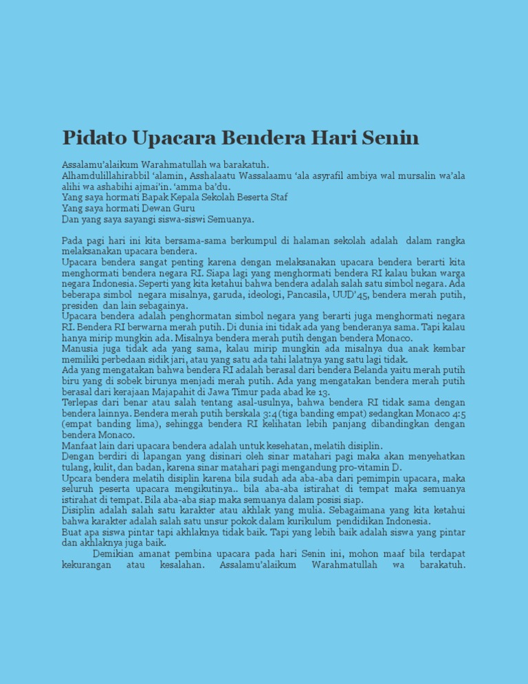 Pada setiap pelaksanaan kegiatan upacara bendera yang dilaksanakan di setiap sekolah / madrasah yang rutin diadakan pada hari senin pagi sebelum. Setiap hari senin pagi kita selalu berkumpul di lapangan sekolah untuk melaksanakan upacara. Sugeng rawuh berbagi itu indah. See more of pidato upacara yang menghipnotis on facebook. Tidak berbohong (misalnya dengan berkata apa adanya).