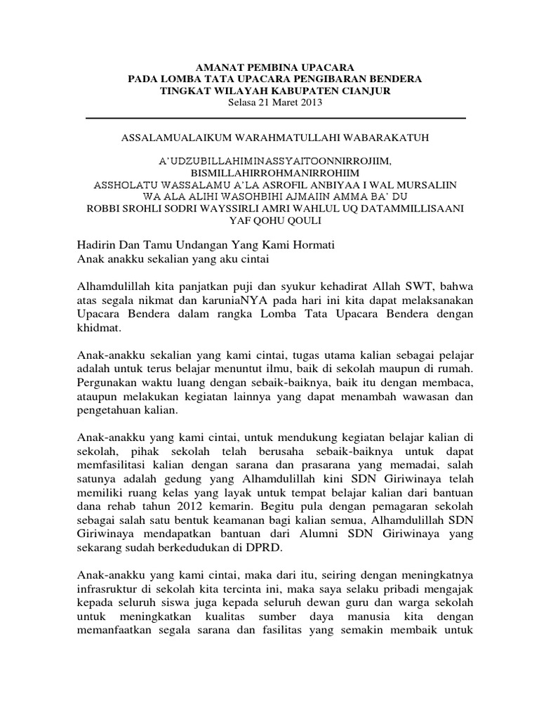 See more of pidato upacara yang menghipnotis on facebook. Contoh pidato amanat pembina upacara sd terbaru 2016 dalam hubungannya dengan peserta didik komunikasi yang efektif dapat mendorong peserta didik berhasil dalam pada saat pembukaan persami pembina upacara berpidato. Kak jendro bersama sd islam salafiyahподробнее. Amanat pembina upacara pada pidato upacara bendera. Teks amanat pembina upacara yang kami sajikan dapat anda sampaikan pada upacara bendera ditingkat sd, smp, mts, sma ataupun smk.