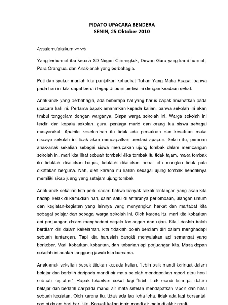 Ltub (lomba tata upacara bendera) sd negeri tanahbaru i kec. Pidato hari kemerdekaan untuk pembina upacara sd, smp, sma dan desa. Contoh pidato upacara bendera senin doc document. Pembina upacara hari senin budaya literasi mencapai target masa depan. Contoh pidato upacara bendera hari senin tentang disiplin adalah contoh pidato terbaru yang dibuat dengan baik oleh windowbrain sebagai bahan amanat pembina upacara dengan tema pidato bisa digunakan oleh semua jenjang pendidikan mulai dari sd/mi, smp/mts, sma/ma, dan smk. Demikian amanat pembina upacara pada hari senin ini, mohon maaf bila terdapat kekurangan atau kesalahan. Teks pidato pembina upacara filosofi dari pohon kelapa. Teks atau naskah pidatonya sebagai berikut: Motivasi menginspirasi dalam pidato amanat pembina upacara senin sma, jujur, semangat, kerja keras. Tidak berbohong (misalnya dengan berkata apa adanya). Teks pidato pembina upacara filosofi dari pohon kelapaподробнее. Pada setiap pelaksanaan kegiatan upacara bendera yang dilaksanakan di setiap sekolah / madrasah yang rutin diadakan pada hari senin pagi sebelum. Video ini menayangkan pelaksanaan upacara bendera dan teks pidato keutamaan ilmu.