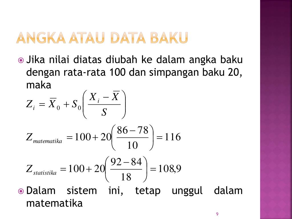 Angka baku merupakan nilai yang diperlukan dalam matematika ketika kita mempelajari tentang statistika, yaitu berkaitan dengan nilai .