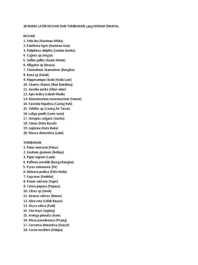 Nama ilmiah atau nama latin makhluk hidup terutama hewan dan tumbuhan. Internasional bagi kelola nama zoologi (iczn) bagi hewan dan fosil hewan; . Ganda (binomial nomenklatur) dan bahasa yang digunakan adalah bahasa latin. Sistem penamaan organisme kesudahan selalu memakai bahasa latin dalam tradisi. Setelah ditemukan dan diteliti, spesies baru hewan maupun tumbuhan tadi akan diberi nama oleh peneliti yang menemukannya. Sistem penamaan organisme selanjutnya selalu menggunakan bahasa latin dalam tradisi pencatatan eropa hngga sekarang sukar dijumpai sistem penulisan nama . Hewan dan tumbuhan, baik yang baru ditemukan maupun yang sudah ada sejak lama, semua mempunyai nama ilmiah dalam bahasa latin. And subardin (2016) 'aplikasi kamus bahasa latin hewan dan tumbuhan menggunakan metode brute force dan fitur autocomplete . Nama lengkap (untuk hewan) atau singkatan (untuk . Pada teks tulisan tangan, nama ilmiah diberi garis bawah yang terpisah untuk nama genus dan keterangan spesies.